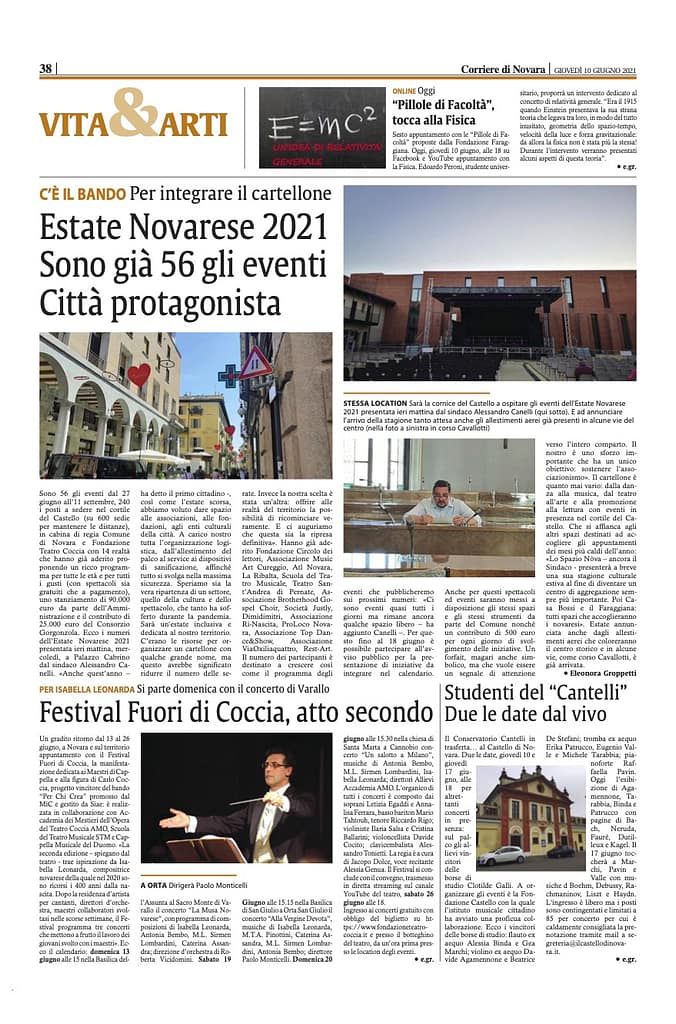 2021 giugno – 2° Festival “Fuori di Coccia” organizzato con il Teatro Coccia nel 4° Centenario della nascita di Isabella Leonarda