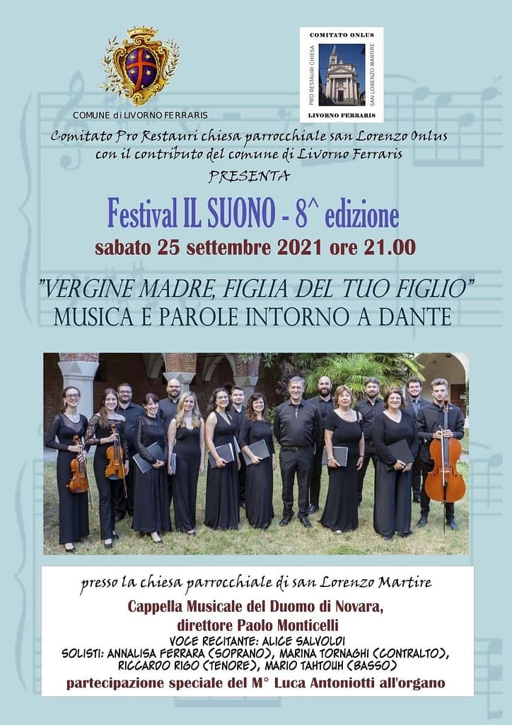 Nel VII centenario di Dante Alighieri, la Cappella Musicale del Duomo di Novara presenta, degli estratti dalla Missa Papae Marcelli e dei Mottetti solistici di G.P. Palestrina, intervallati da letture estrapolate da ognuna delle tre cantiche della Divina Commedia incentrate sulla figura di Maria SS.